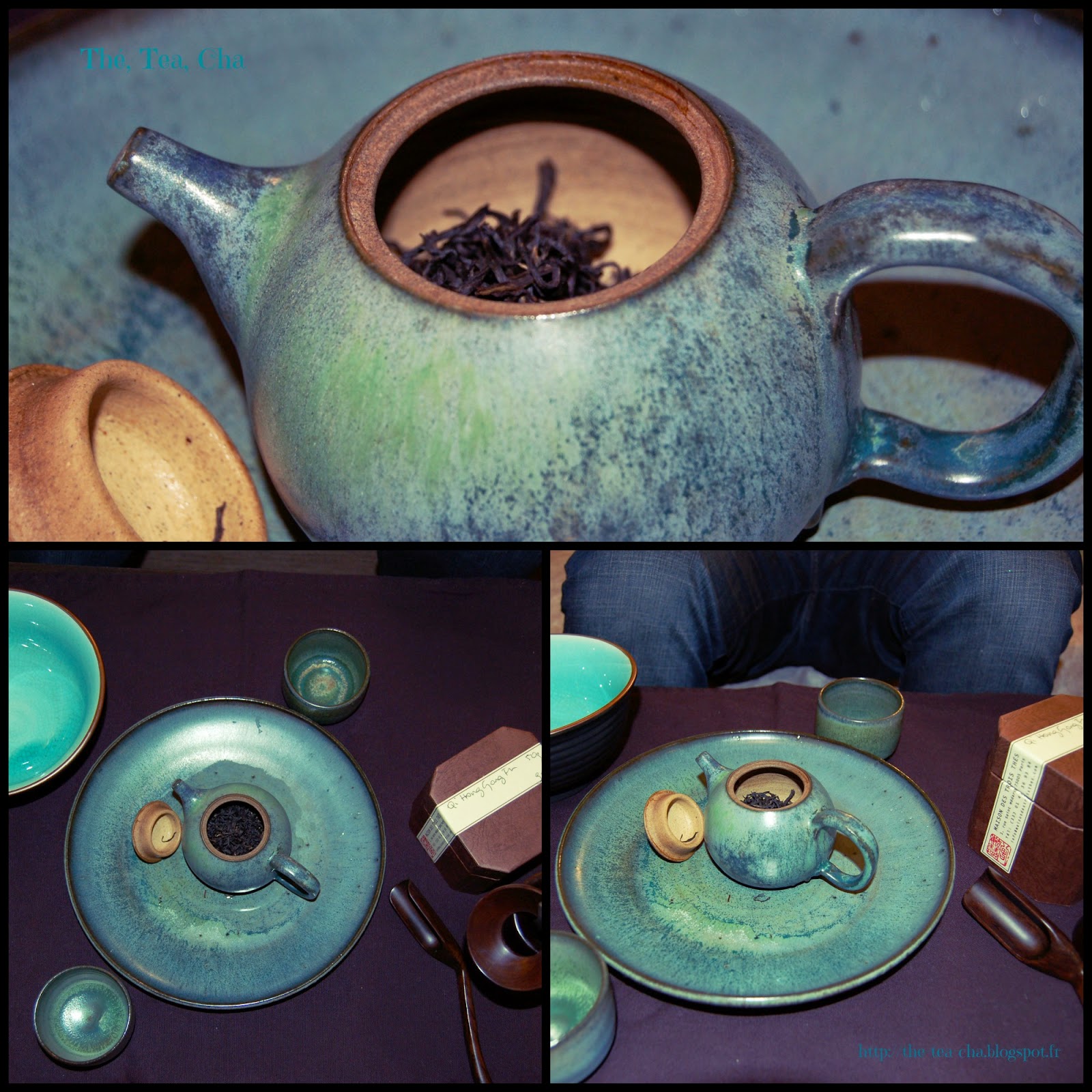 | Qi Hong Gong Fu (Maison des Trois Thés, Paris 5e), thé rouge de Chine ; service à thé "moondust" bleu-vert par Master Weilong (site Taïwan Tea Crafts) |