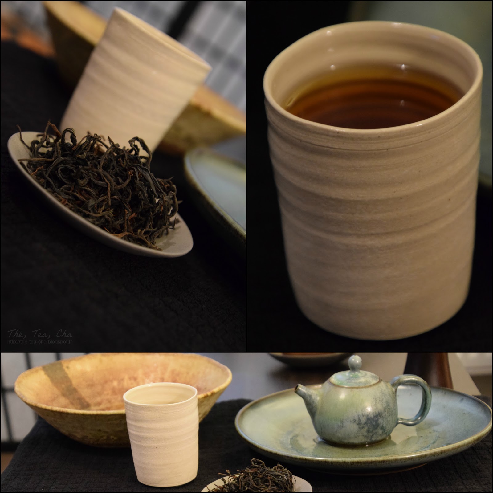 | Belles feuilles sèches du Ye Sheng Hong Cha 2015 dans une soucoupe/présentoir par Sylvie Godel; nouveau yunomi blanc par Ikuyo Pupier, acquis la semaine dernière à la Galerie des Sélènes; théière "moondust green bell" et son assiette par monsieur Weilong; shuifang par Jérôme Hirson. |