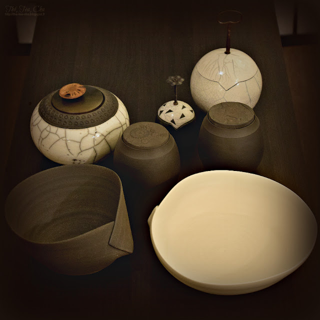 Par contre, s'il n'est pas difficile de trouver un usage, voire plusieurs, au plat creux de porcelaine, que ce soit pour le thé ou pour le repas, il est moins aisé d'employer le "pot", dont le grain accroche et dont la terre est particulièrement poreuse (pas question d'y mettre du liquide, ne servira donc pas de shuifang). Je songe y faire pousser une plante comme suggéré par Marine elle-même...